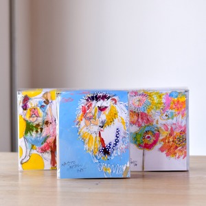 表面は、キタムラさんの書いた動物などをポストカードにしたものを封入しています。
