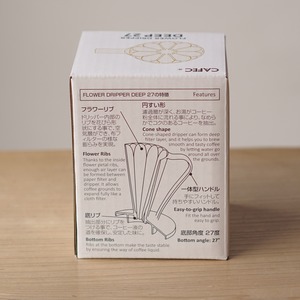 世界で一番最初に円すい形コーヒーフィルターペーパーを開発したCAFEC(三洋産業)が、独自の深層濾過の理論を基に、究極の一杯のためのドリッパーを開発。底部の角度を27度の鋭角にし、積層高度をさらに高める事で、コーヒーが持つ旨みを最大限に引き出す構造を実現。抽出を科学した究極のドリッパーです。